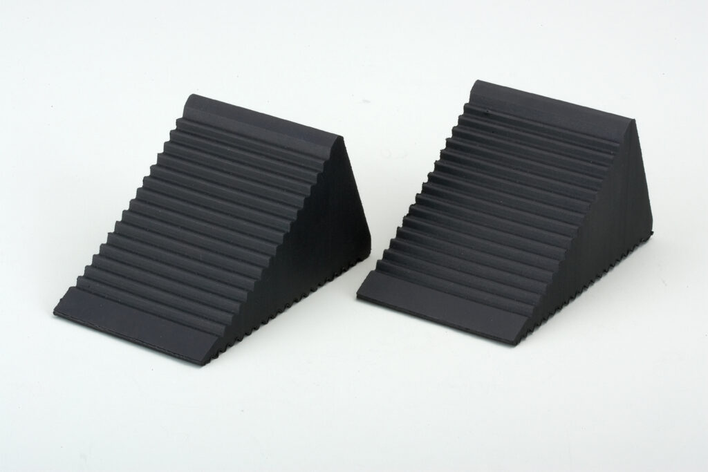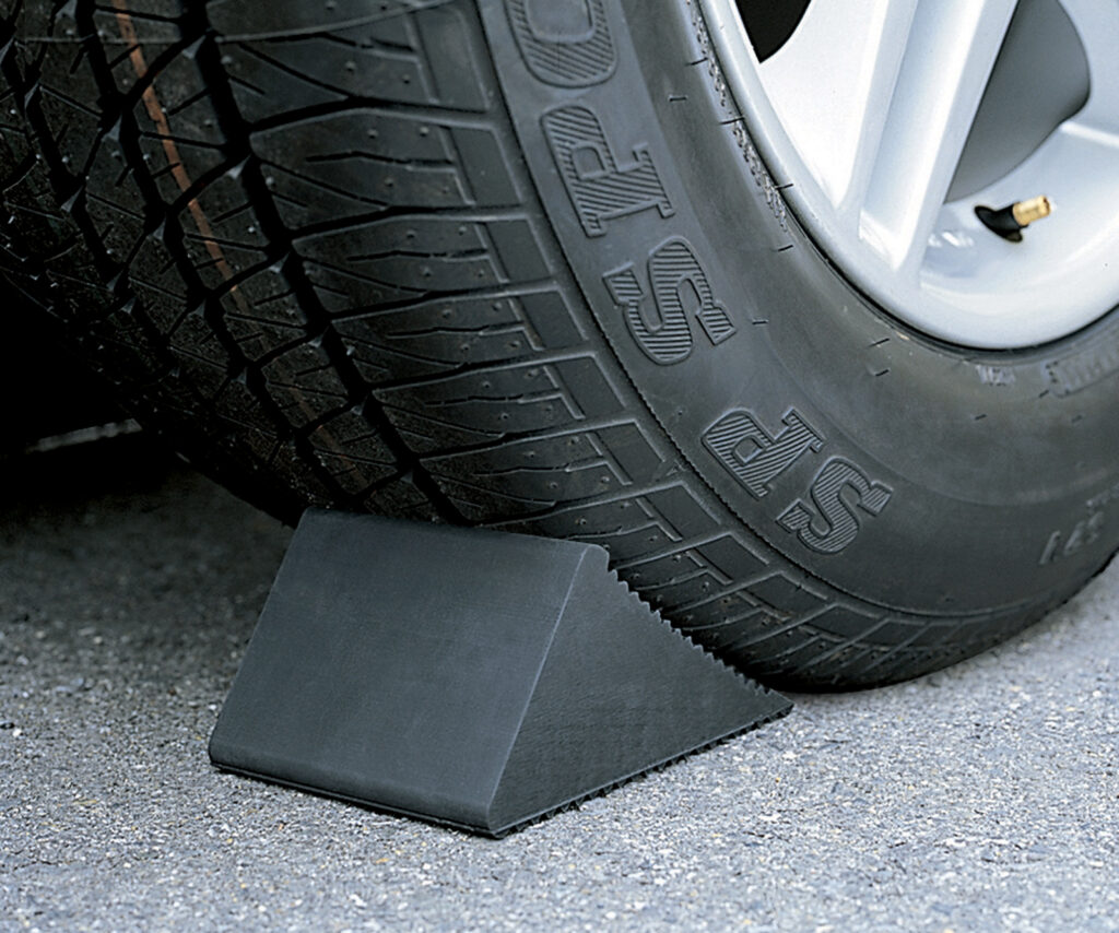 車が動くのを防ぐ安全アイテム | タイヤを前後に挟むようにセットする。ゴム製が滑りにくく、地面にしっかり固定できる。 |