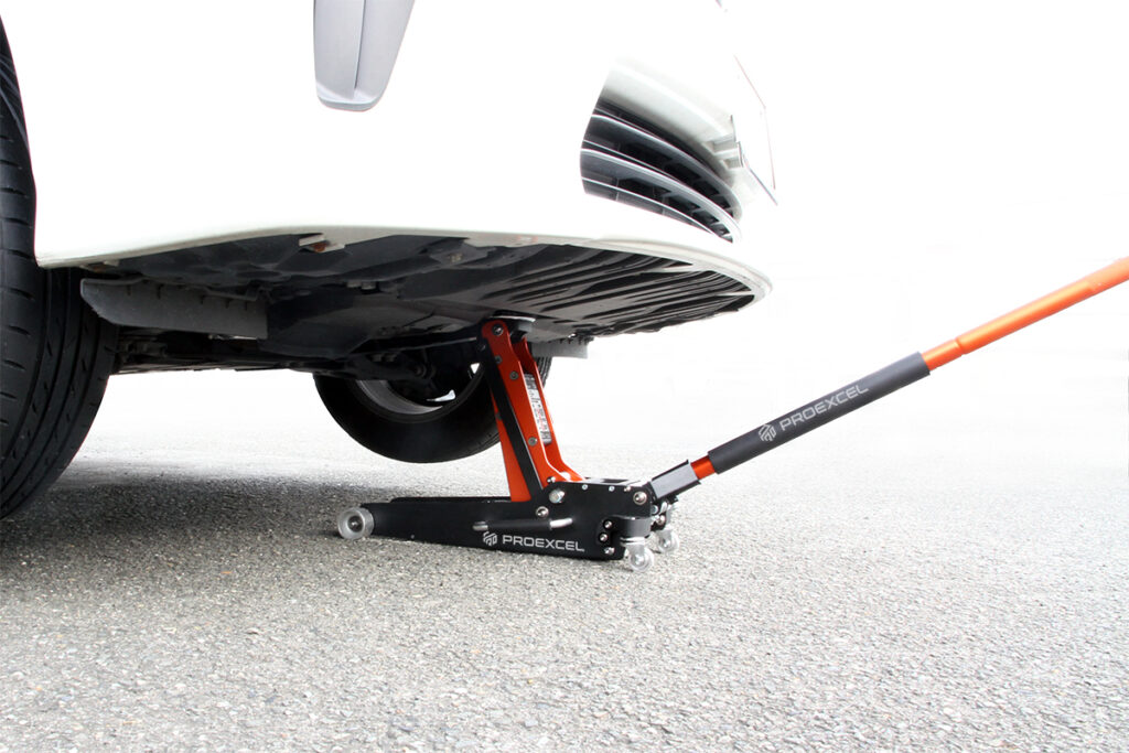 車体を持ち上げる | 耐荷重は車両重量の1.5倍を目安に。油圧式フロアジャッキは安定性が高く、作業も楽。 |