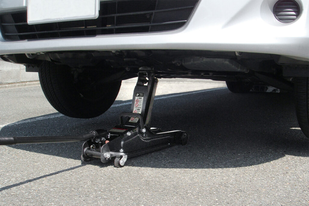 安全の鉄則:ジャッキアップは平坦な場所に車を止めて、周囲の安全を確保した上で行いましょう。また、ジャッキだけで車体を支えるのは非常に危険です。必ずジャッキスタンドを併用し、車体を安定させた状態で作業を行いましょう。