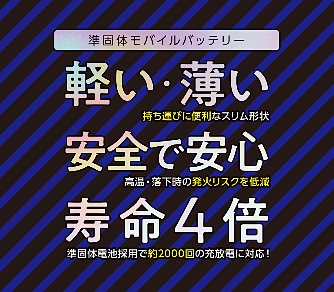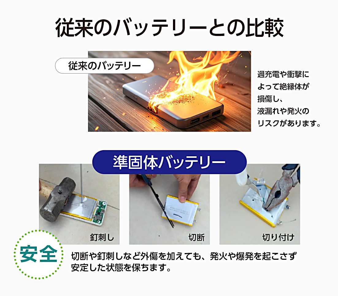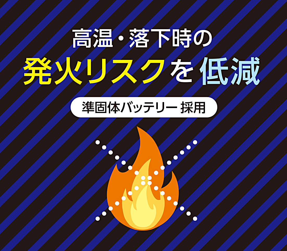 ※電解質をゲル化した準固体電池を採用し、リチウムデンドライトの発生を抑制。発火や破裂のリスクを低減します。