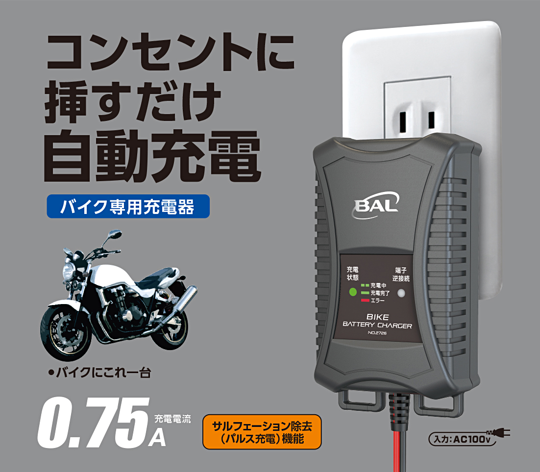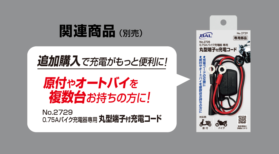 ■バッテリーターミナルを外さずに充電できます。(※原付などのカプラタイプを除く)