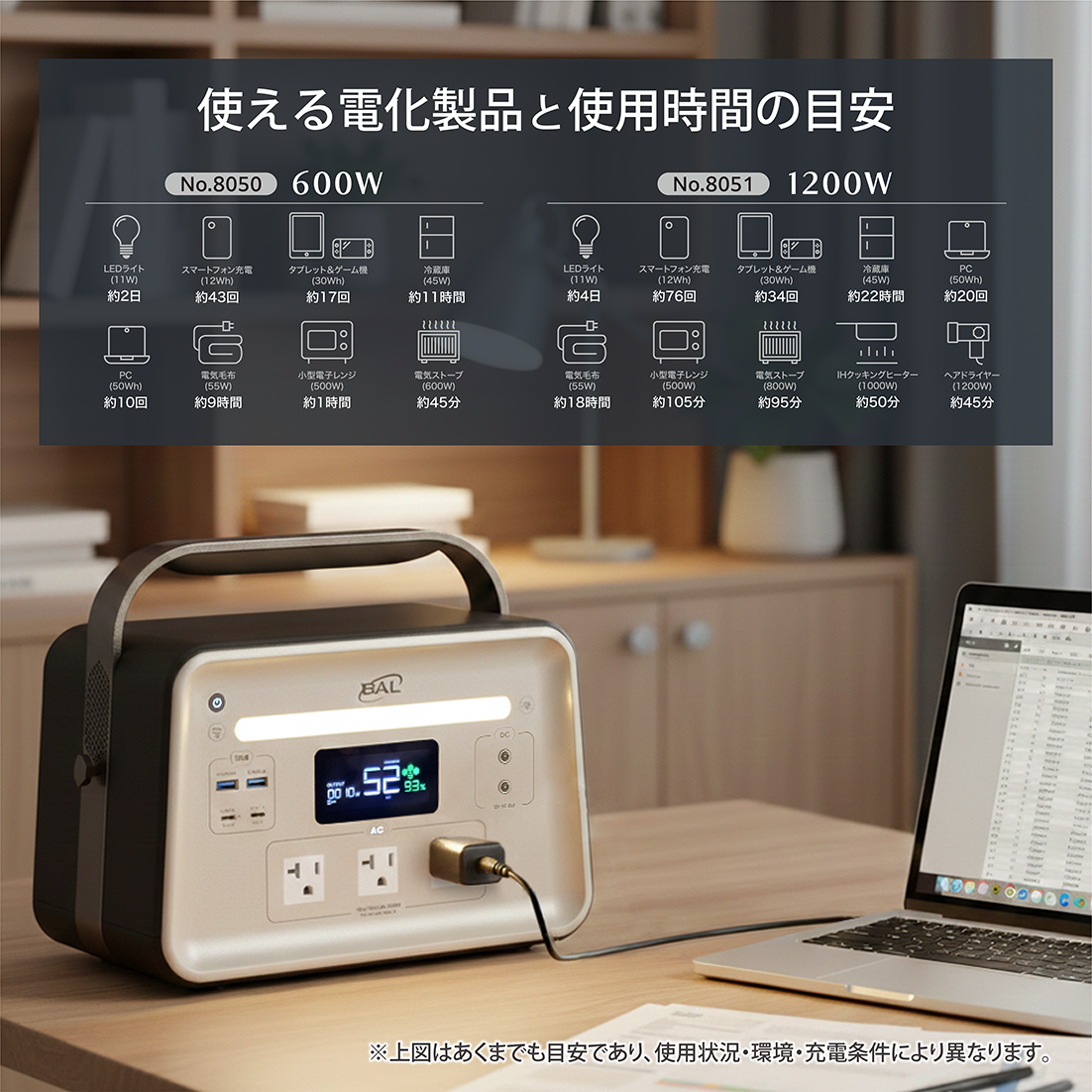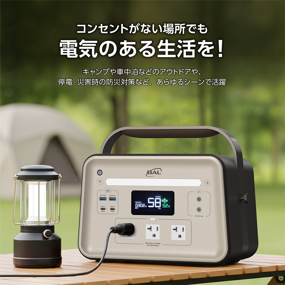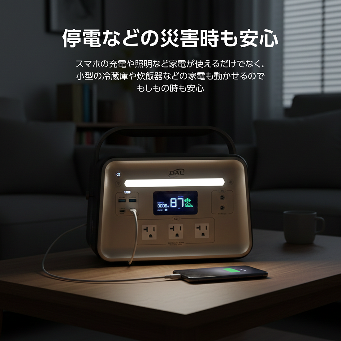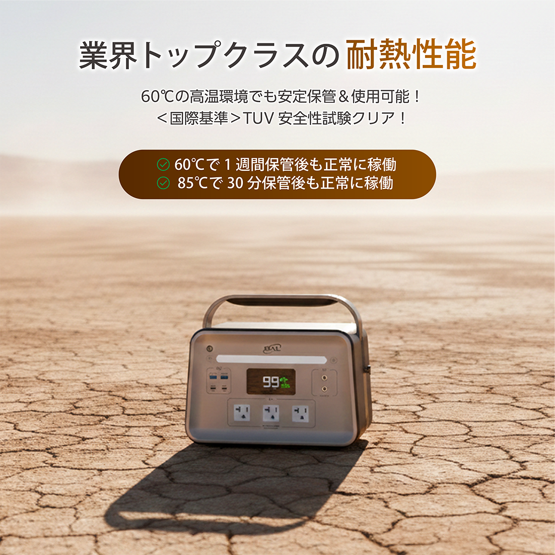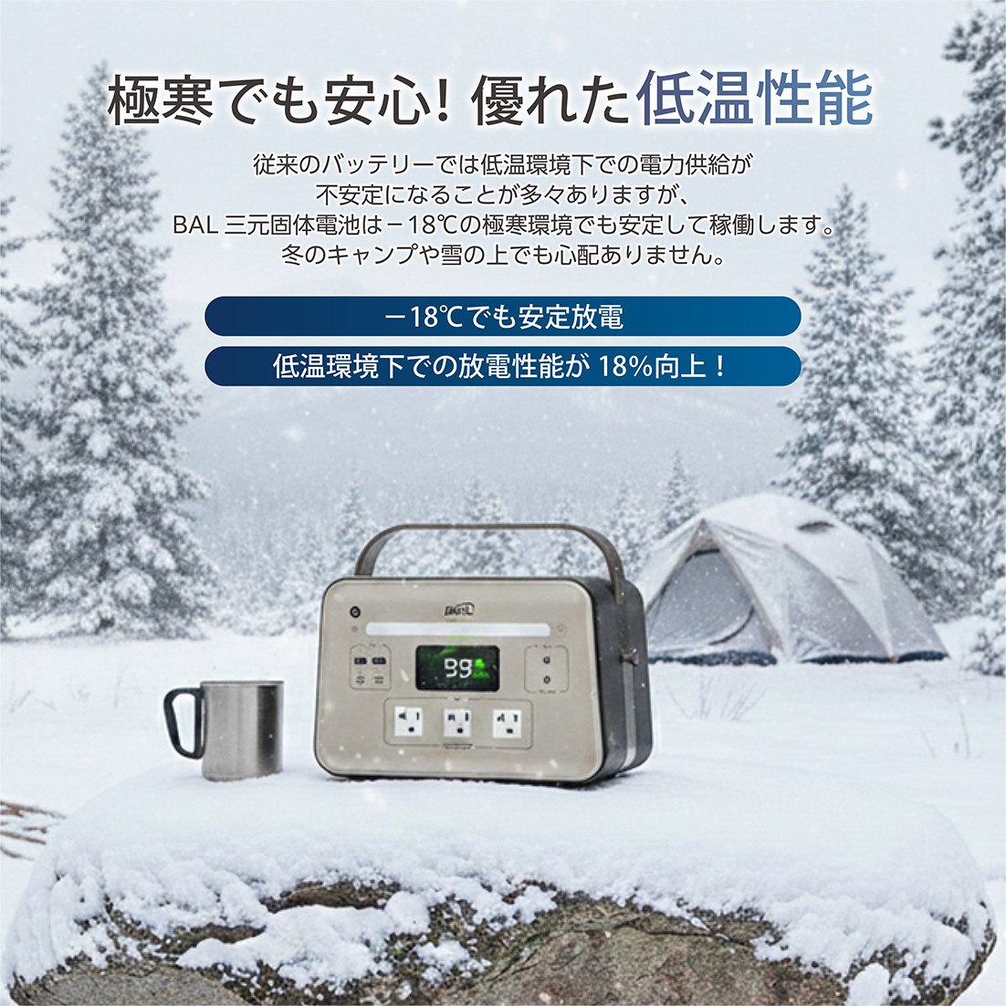 ・従来のバッテリーでは低温環境下での電力供給が不安定になることが多々ありますが、BAL三元個体電池は−18℃の極寒環境でも安定して稼働します。冬のキャンプや雪の上でも心配ありません。