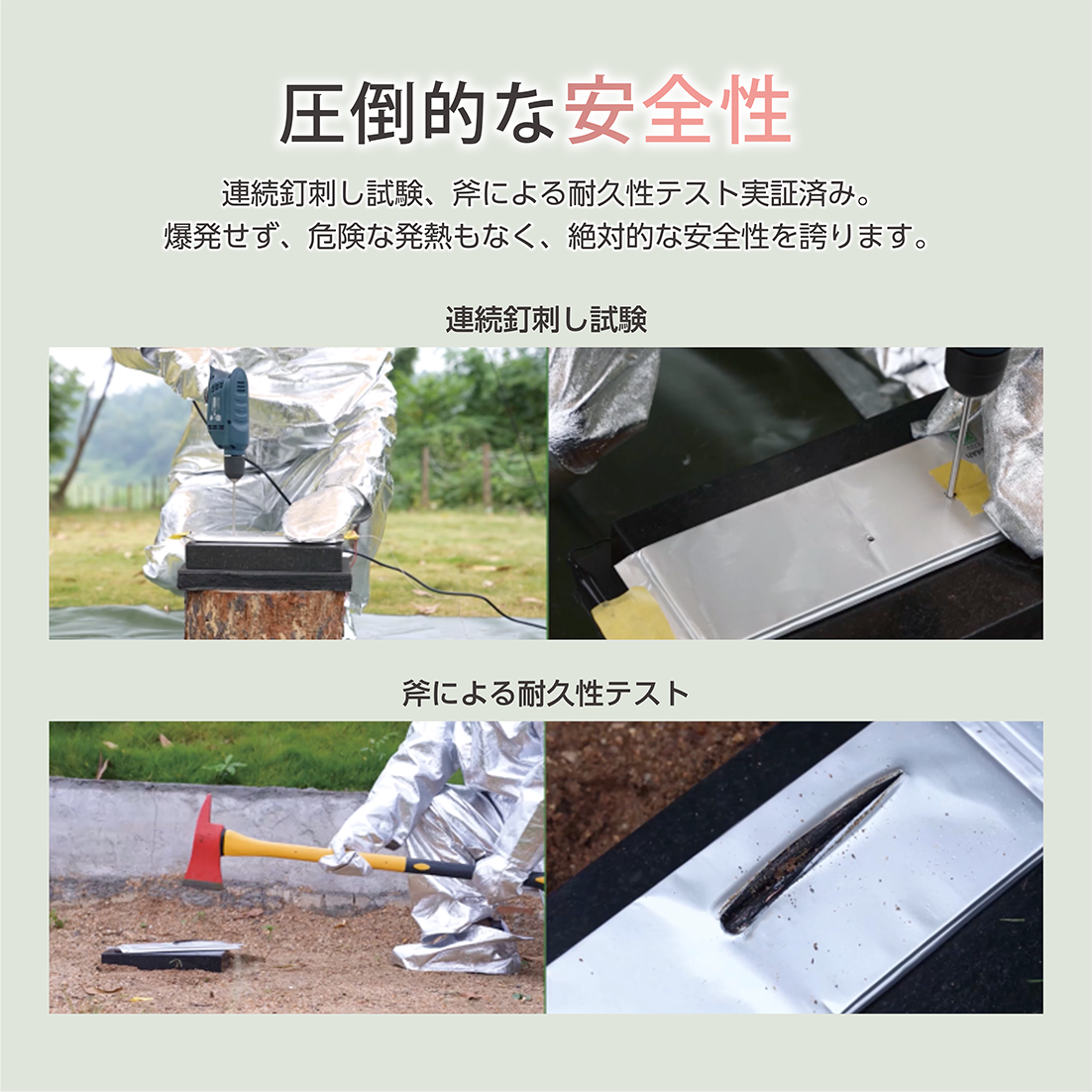 ・連続釘刺し試験、斧による耐久性テスト実証済み。爆発せず、危険な発熱もなく、絶対的な安全性を誇ります。
