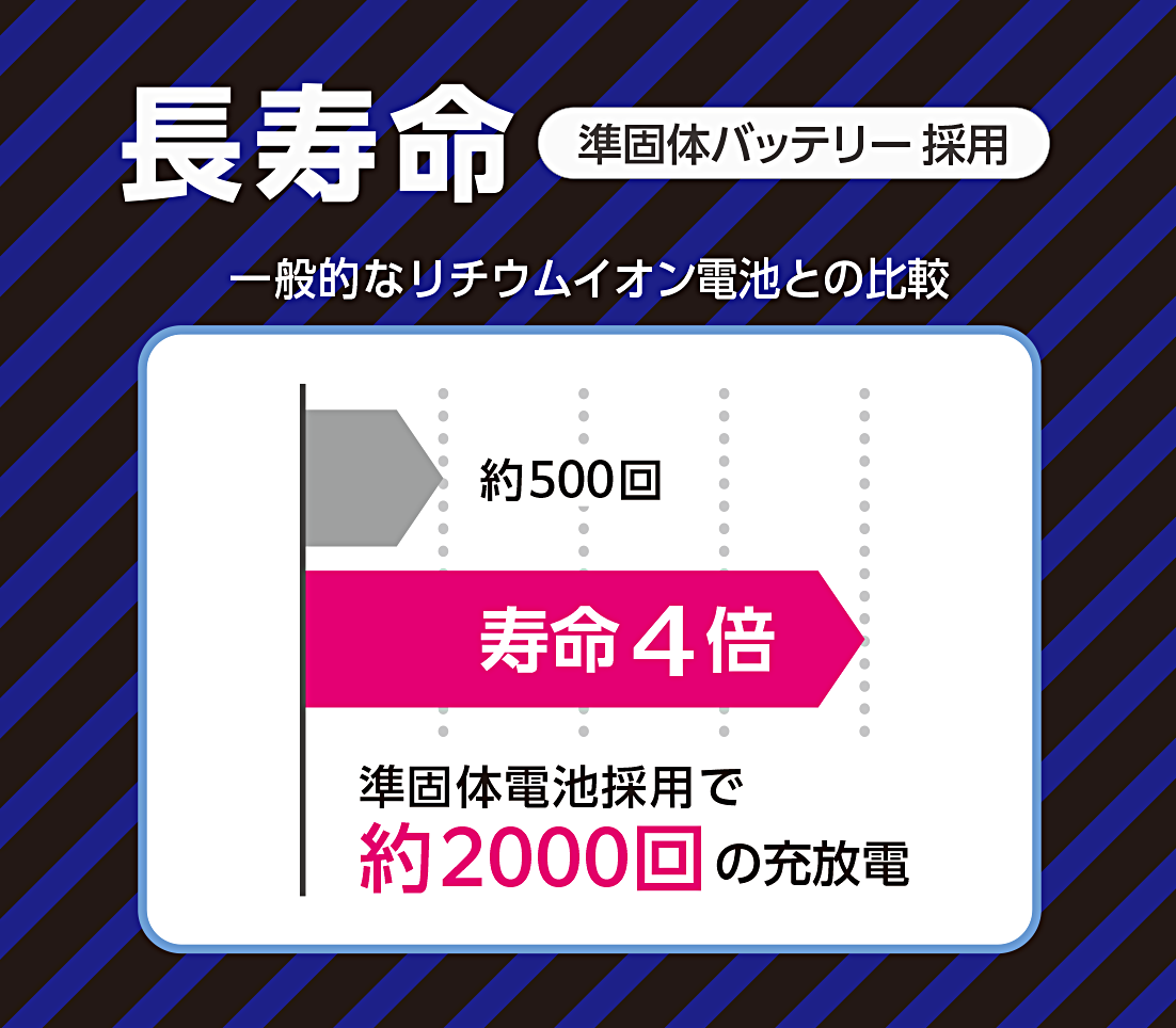 準固体リチウムイオン電池採用で約2000回の充放電に対応!